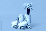 Vintage roller skates with bouquet of beautiful narcissus flowers on blue background