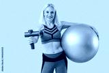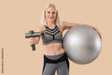 Sporty mature woman with percussive massager and fitball on beige background