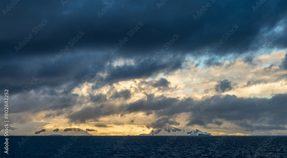 An Antarctic landscape, taken during the golden hour, just after sunrise, in the Gerlache Strait.