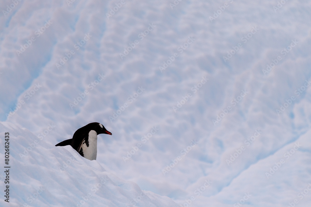 Close-up of a Gentoo Penguin -Pygoscelis papua- standing on an iceberg near Cuverville Island, on the Antarctic Peninsula