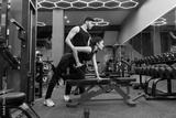 Young indian woman do bent over dumbbell workout exercise with trainer assistance. Fitness and sports activity. Muscle building, Challenge and determination. Copy space.