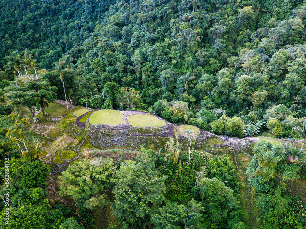 Hidden ancient ruins of Tayrona civilization Ciudad Perdida in the heart of the Colombian jungle. Aerial view from above. Lost city of Teyuna. Santa Marta, Sierra Nevada mountains, Colombia wilderness