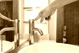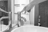 Save water. woman keeps turning off the running water in the bathroom to protect environment. Greening planet, reduce global warming, Save world, life, future, risk energy, crisis , water day.