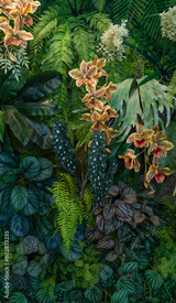 Tropical green leaves background, Nature Wall Lush Foliage Leaf Texture, Vertical image.