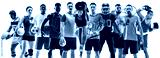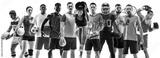 Collage. Tennis, running, badminton, soccer and American football, basketball, handball, volleyball, boxing, MMA fighter and rugby players. woman and men standing isolated on transparent background