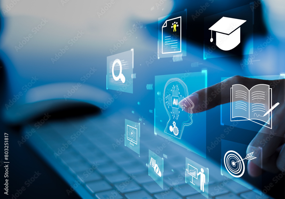 E-learning technology, webinar, online education and training to develop new skills and knowledge. AI-enhanced learning with personalized courses. Remote learning on internet. Virtual screen