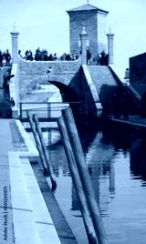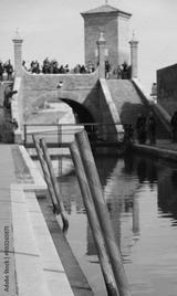 Red and blue mooring poles and the bridge, symbol of the city of Comacchio in Italy