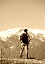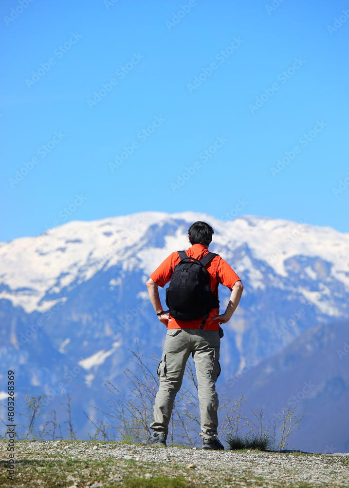 hiker with black backpack on shoulders before the big trek towards snow-capped mountains