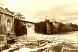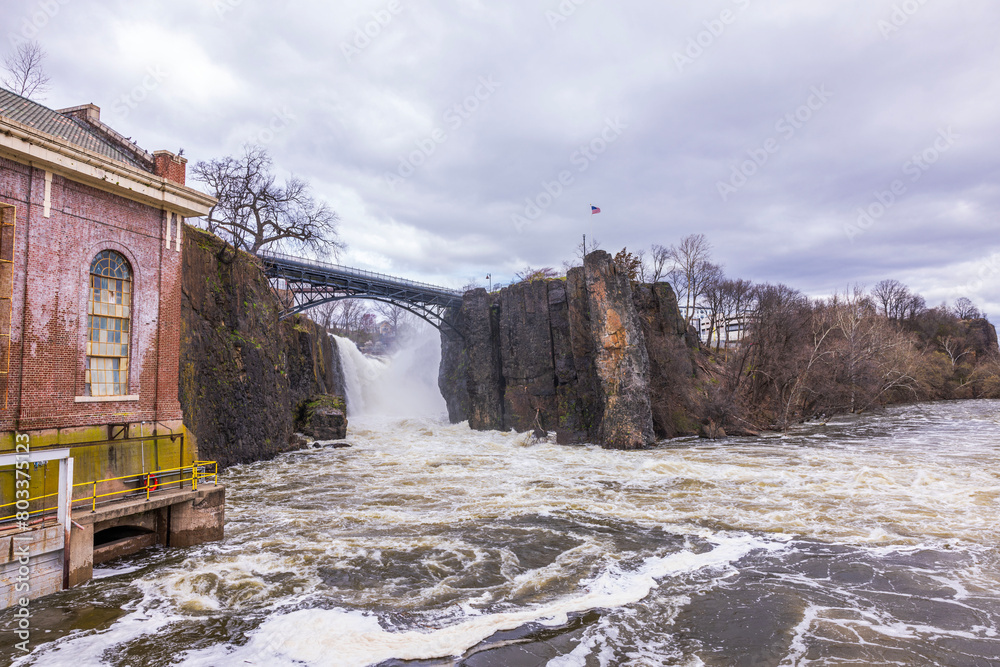 Beautiful view of panorama majestic Paterson waterfall in New Jersey's park, embraced by towering cliffs amidst the vibrant ambiance of spring.
