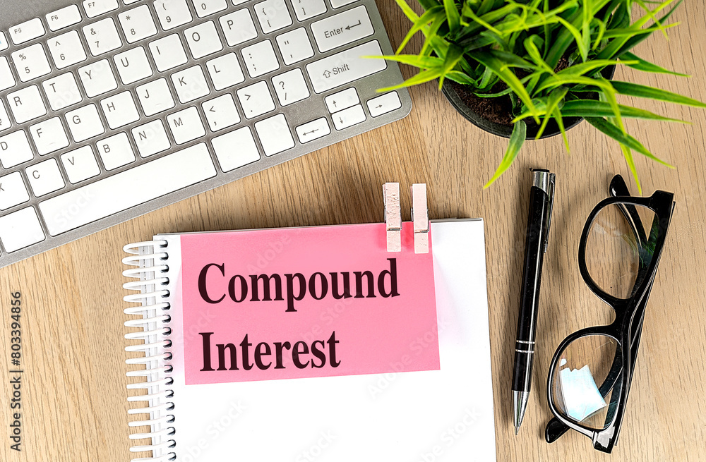 COMPOUND INTEREST text pink sticky on notebook with keyboard, pen and glasses