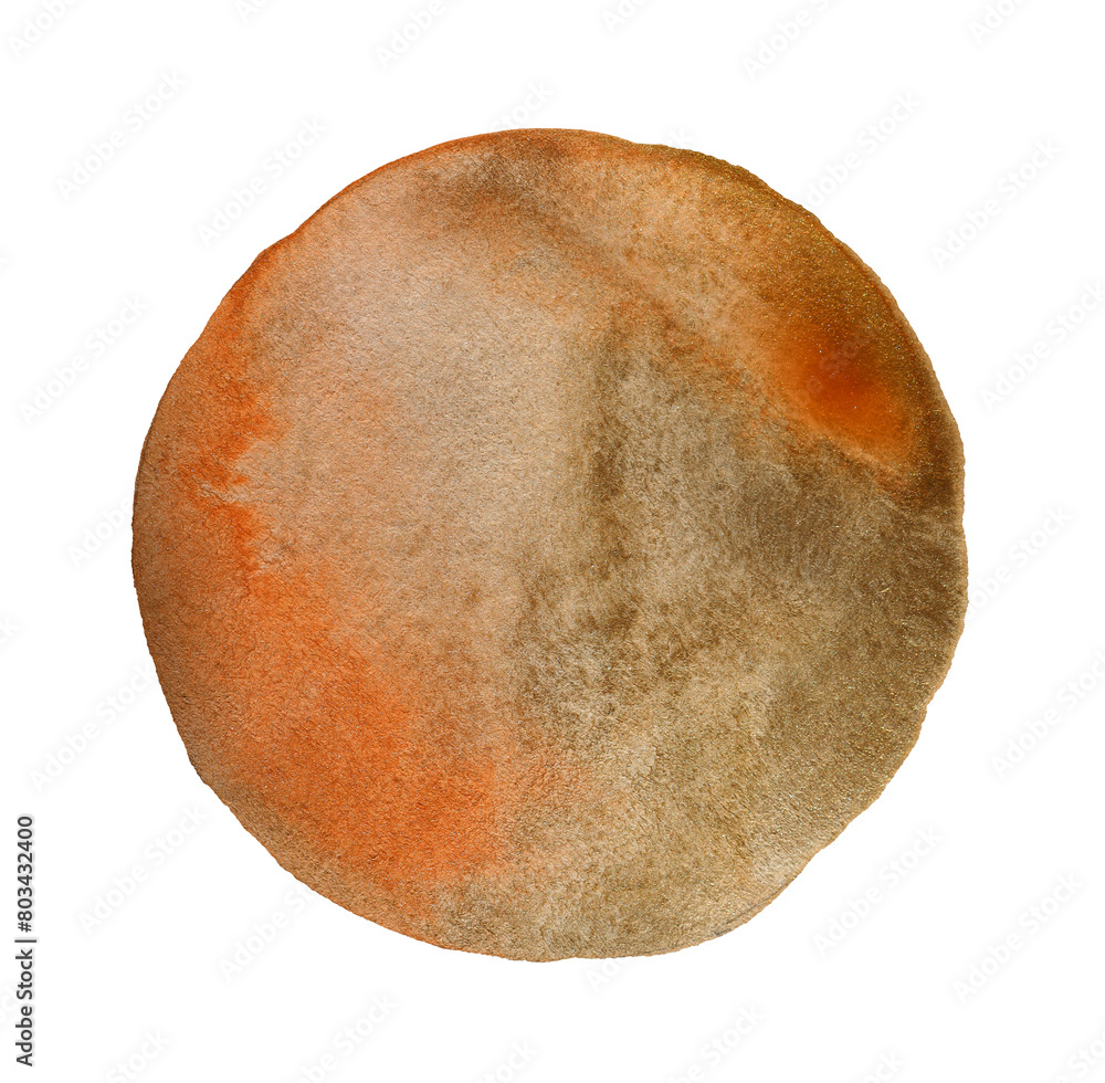 Brown, gold, bronze ink metallic watercolor paper grain texture stain circle blot on white background.