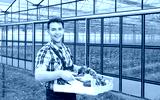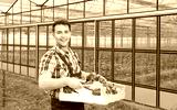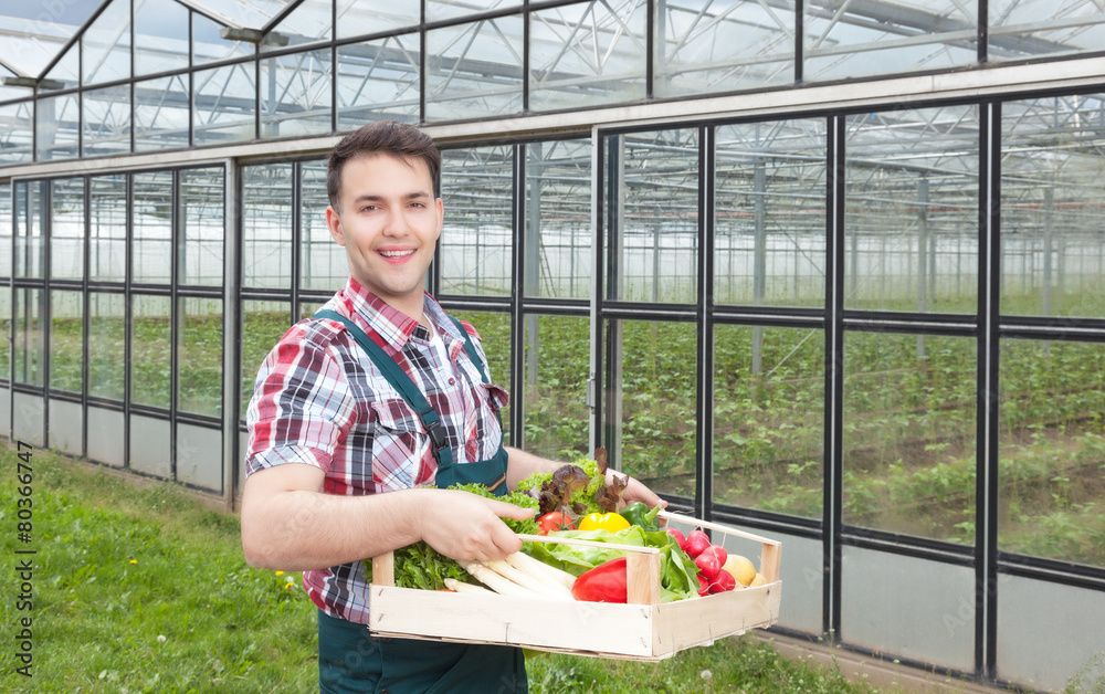Sympathischer Landwirt mit Gemüse vor seinem Gewächshaus