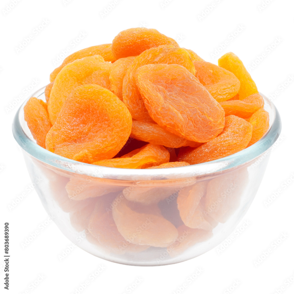 Dried apricots in a glass bowl isolated transparent