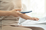 woman use phone scan barcode or QR codes to pay credit card bill after receiving document invoice. payment, receive, paying electricity, digital payments, technology, scanning, financial transactions