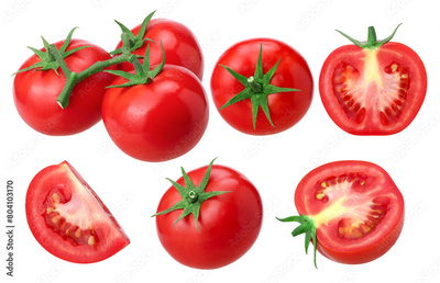 bunch of fresh red tomatoes, half and slices tomatoes isolated, transparent PNG, PNG format, cut out