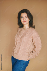 Studio portrait of beautiful 40 year old woman posing on beige background