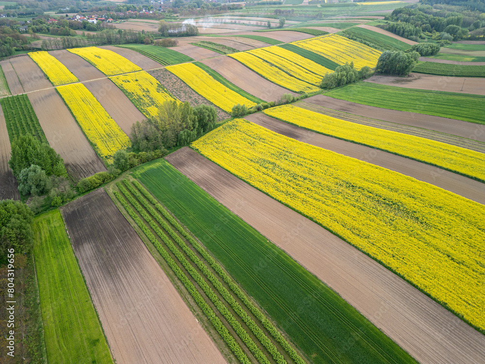 Undulating agricultural landscape of Podkarpackie province with fragmented land structure and rapeseed fields, Poland