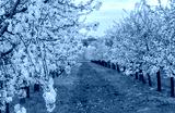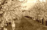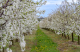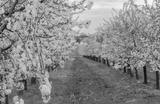 Kwitnący sad wiśniowy na zboczu wzgórza. Kwietniowe popołudnie w wiśniowym sadzie ozdobionym falą białych kwiatów „gardzących śmiercią” (bushido).
