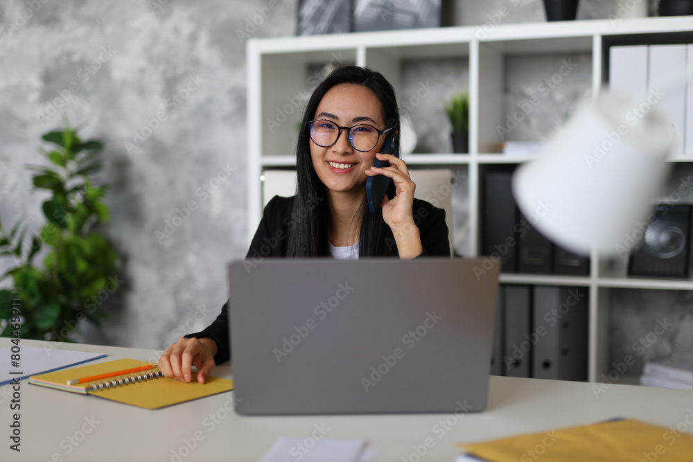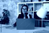 An Asian businesswoman in her office, confidently communicating on her laptop and smartphone, managing her business.