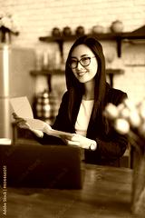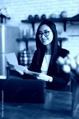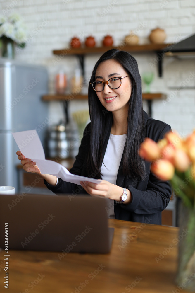 An Asian woman reads a finance bill, looking serious at her desk in a home office.