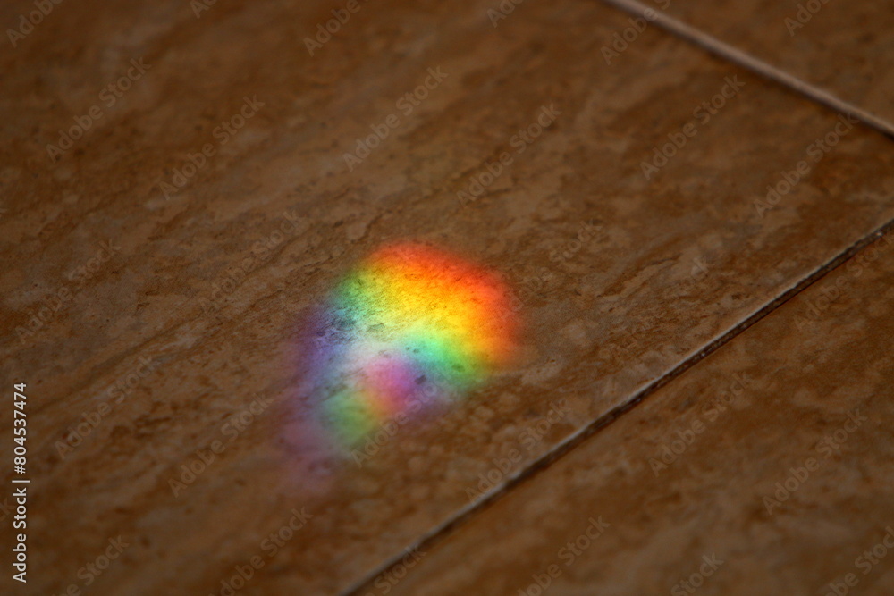 A multi-colored sunbeam is reflected on the tiles.
