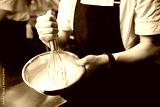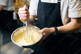 Cropped male chef mixing dough with whisk in bowl for cooking dish in restaurant
