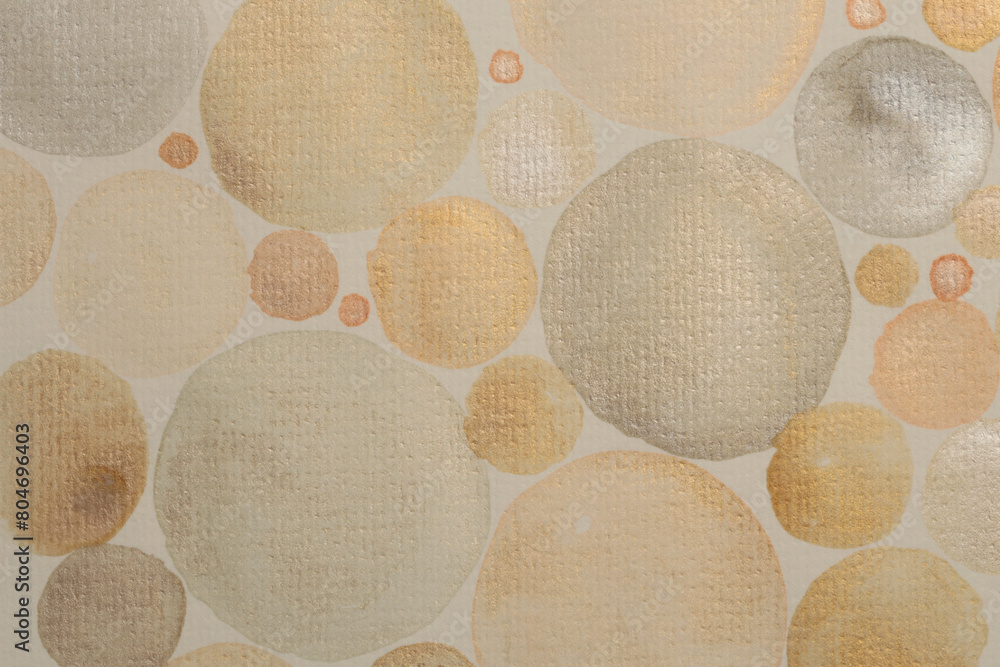Gold bronze glitter ink watercolor circle stain blot on beige grain paper texture background.