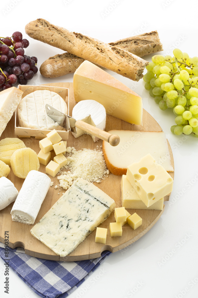 Käseplatte mit verschiedenen Käsesorten und Weintrauben