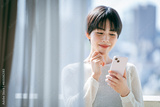 部屋でスマホを操作する女性