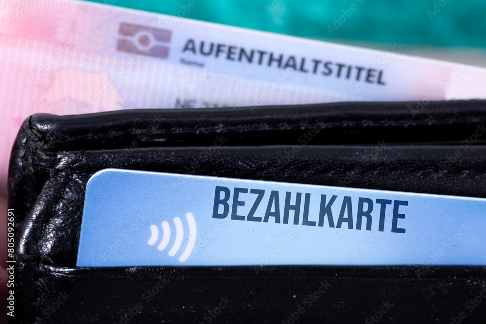 Ein Portemonnaie, Aufenthaltstitel für Deutschland und eine Bezahlkarte