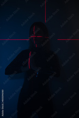 Shine a red laser in the shape of a cross at the girl. Future and virtual reality concept