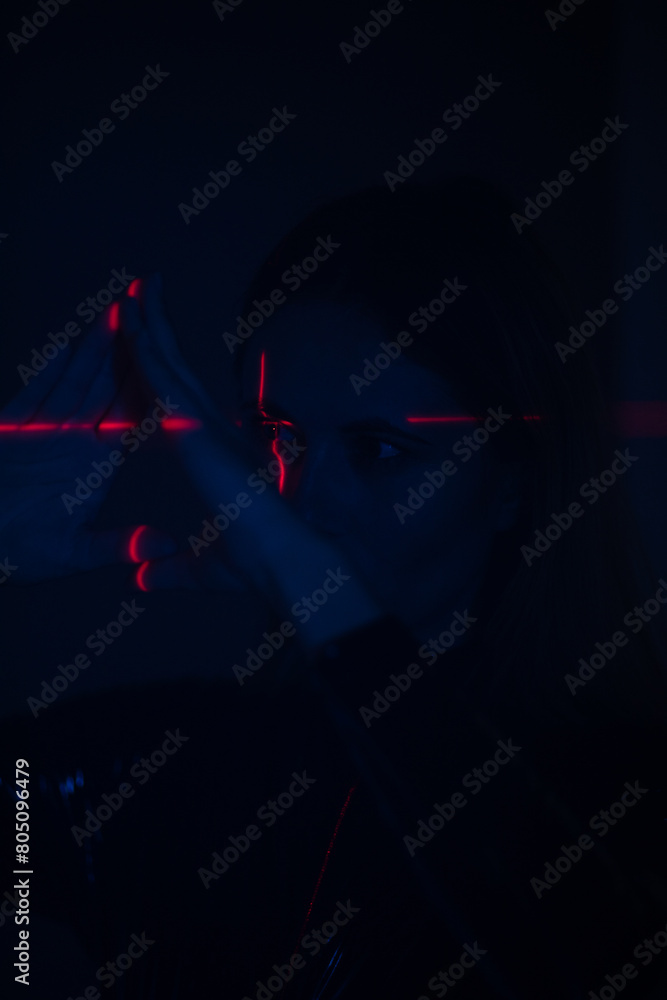Shine a red laser in the shape of a cross at the girl. Future and virtual reality concept
