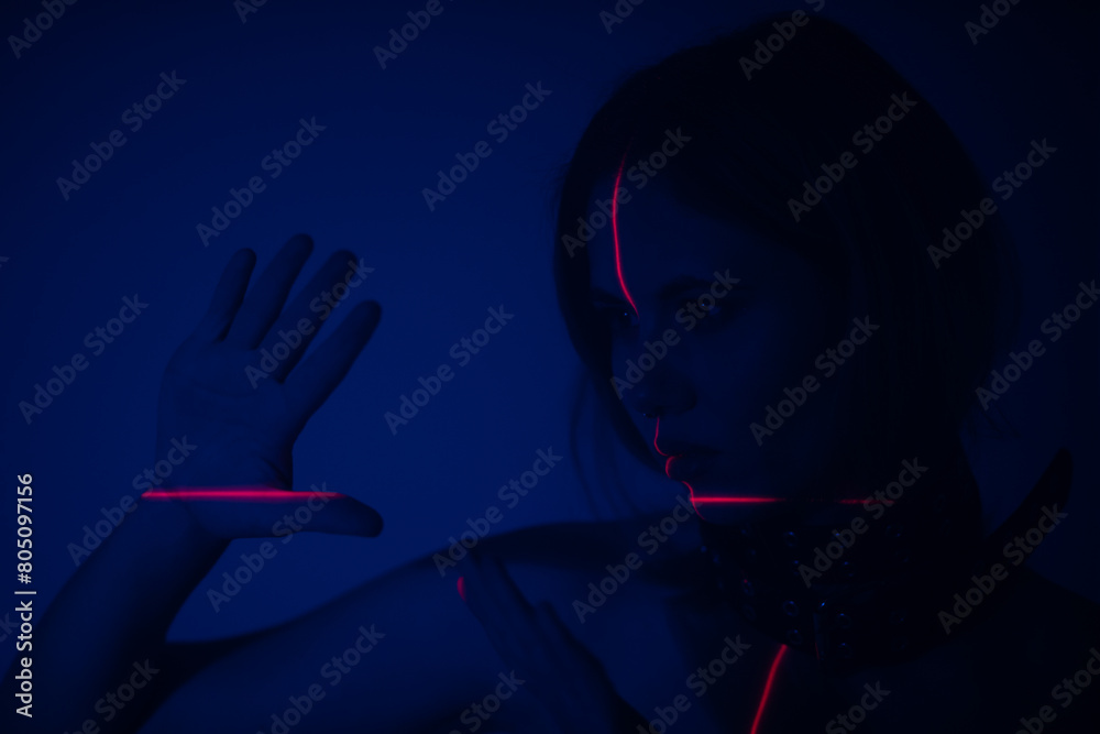 Shine a red laser in the shape of a cross at the girl. Future and virtual reality concept