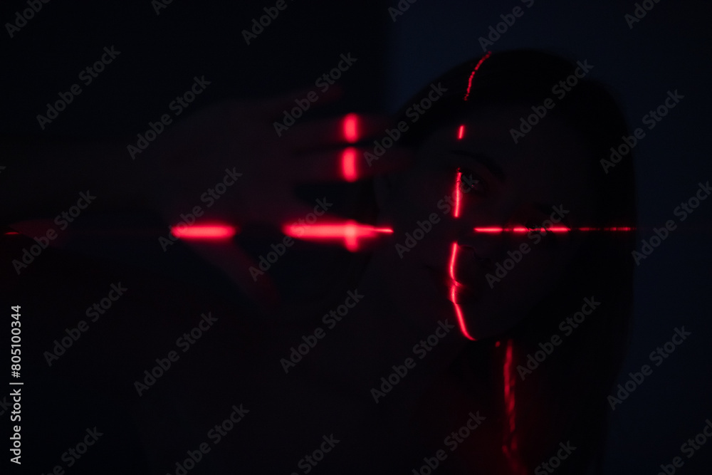 Shine a red laser in the shape of a cross at the girl. Future and virtual reality concept
