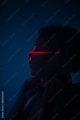Shine a red laser in the shape of a cross at the girl. Future and virtual reality concept