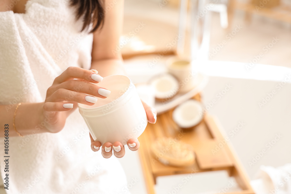 Beautiful young woman with jar of hair mask in bathroom at home, closeup