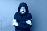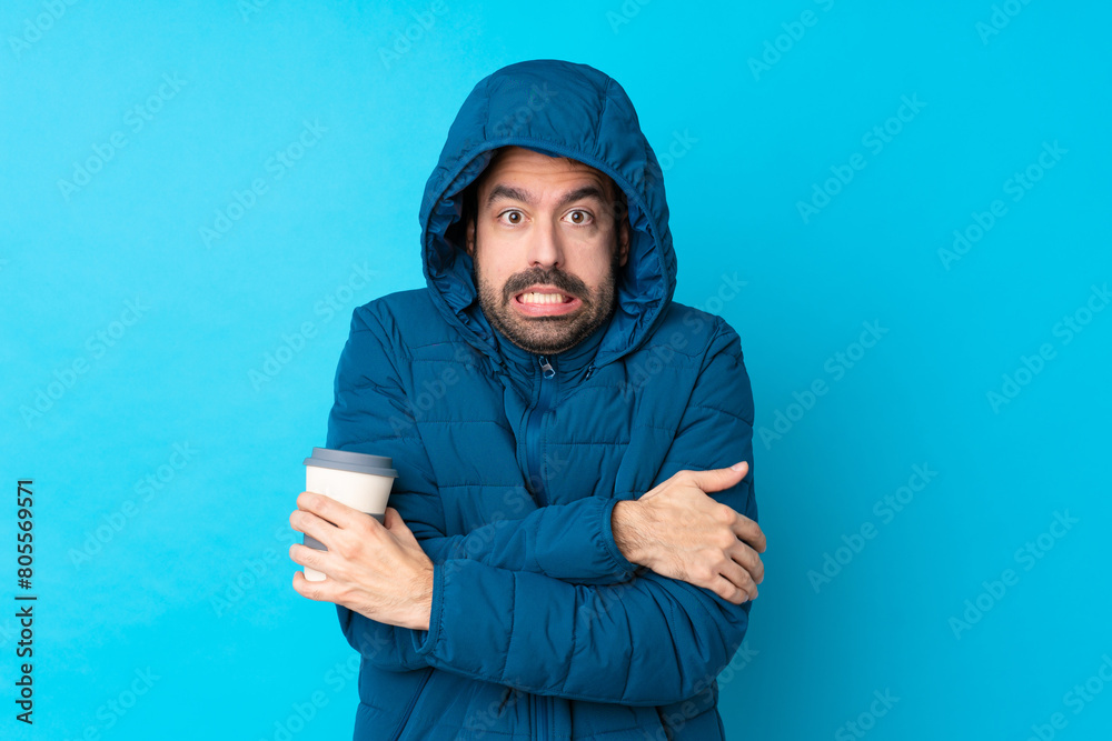 Man wearing winter jacket and holding a takeaway coffee over isolated blue background freezing