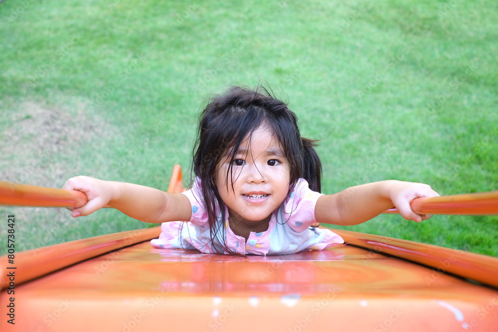 Happy face thai girl play slider in outdoor play park with energy