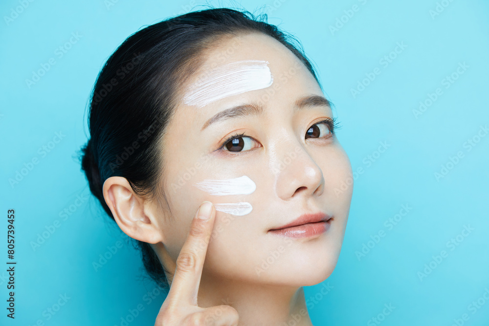 青背景で撮影をした若い女性と化粧品のテクスチャ