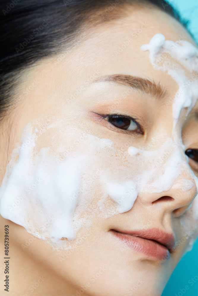 青背景で撮影をした若い女性と化粧品のテクスチャ