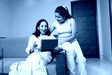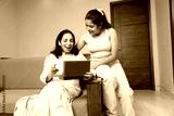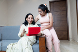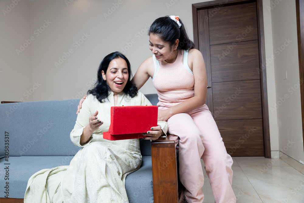 Indian teen daughter Giving Gift box to mother and congratulating her for mothers day
