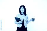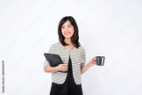 An Asian woman is holding a coffee cup and a tablet against a white background.