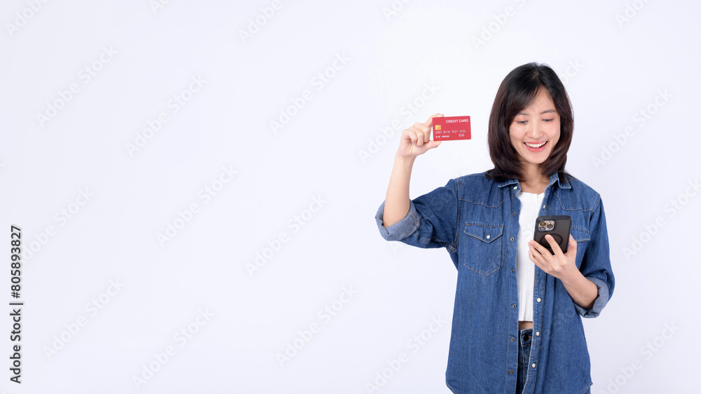 Asian woman wearing denim jean is holding credit card and a mobile phone against a white background, shopping online concept.