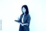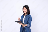 Asian woman wearing denim jean is holding a tablet and a stylus against a white background.