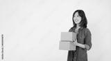 young asian woman wearing orange t-shirt and denim shirt holding parcel box isolated on white studio background, Delivery courier and shipping service concept.