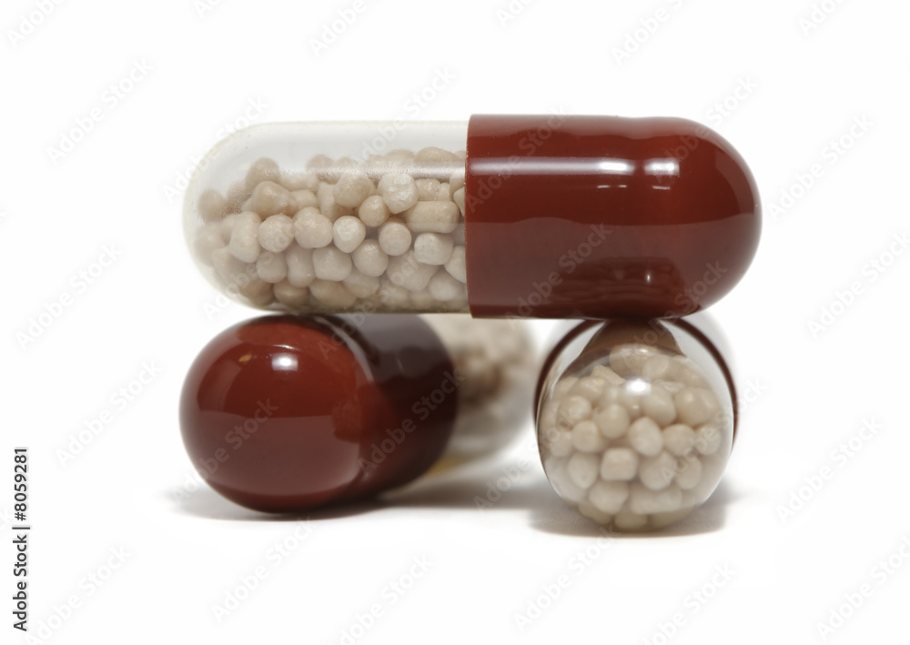 Close-up of three pills on white