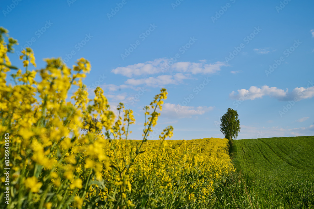 A blooming rapeseed field against the background of a green wheat field with a lonely tree on the edge of a hill