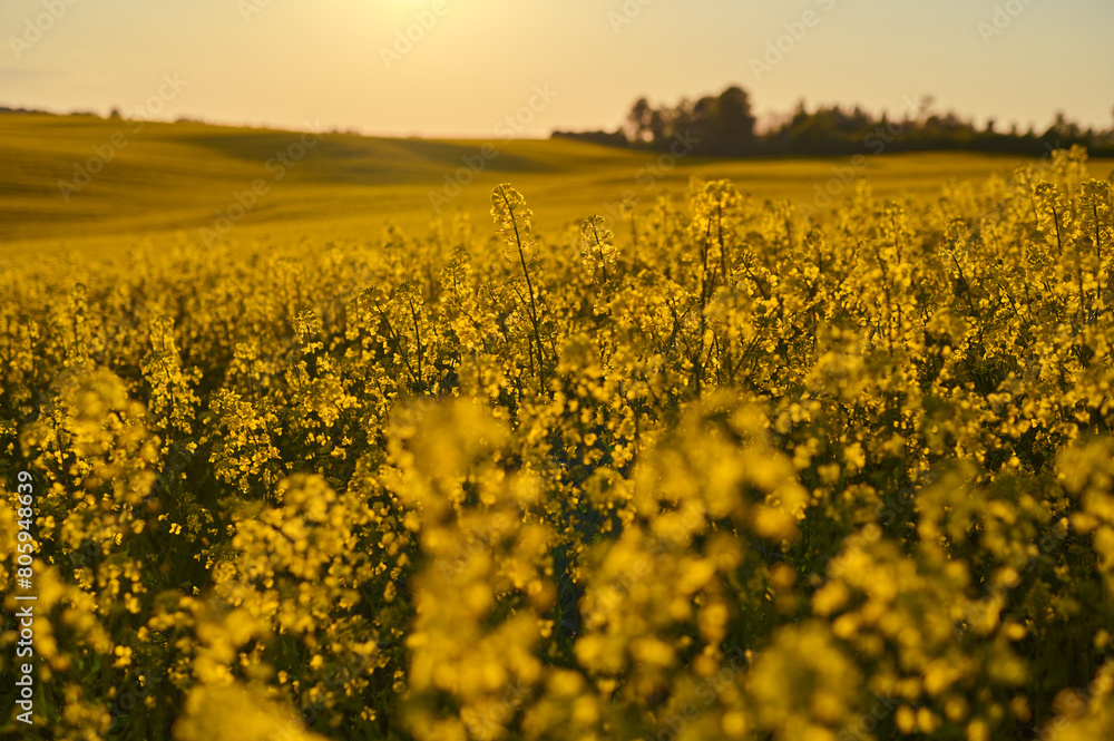 Huge yellow wavy field of blooming rapeseed at sunset