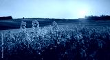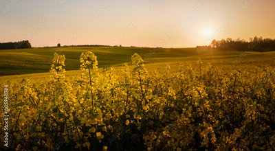 On the horizon, a huge field of blooming rapeseed stretches under the setting sun, and the forest in the distance adds charm to this picturesque evening landscape