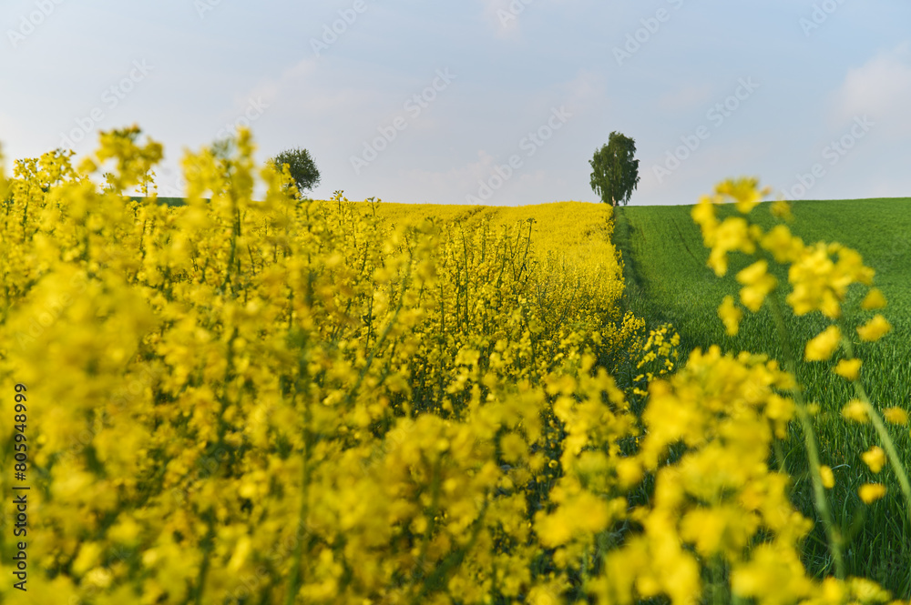 In the middle of a vast gap, between golden rapeseed and a green wheat field, a lonely birch floats, painting a contrast in the spring landscape